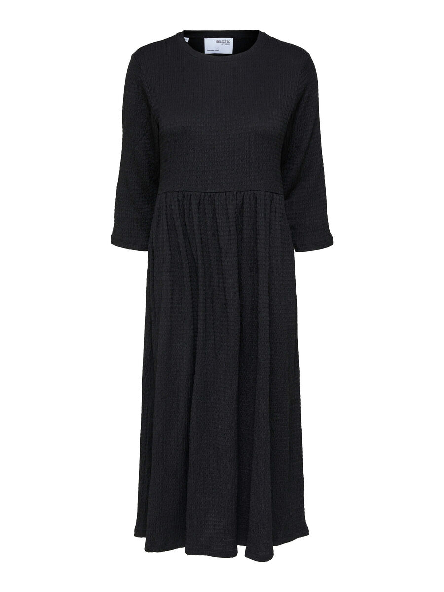 Stoffet er behageligt for huden. Selected Femme - et brand med kant. Kjolen har lange ærmer med smock ved håndleddet en fin v-hals og elastik i taljen med et aftageligt bindebånd.